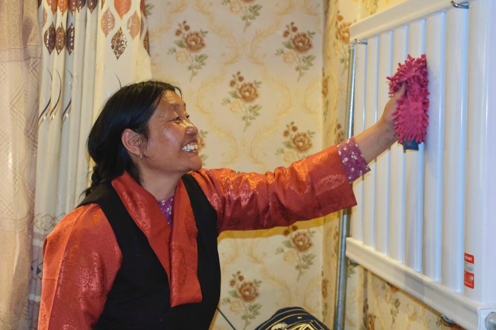 11月20日,那曲市色尼區(qū)團(tuán)結(jié)小區(qū)居民次仁卓瑪在擦拭暖氣片。(周昱龍 攝)