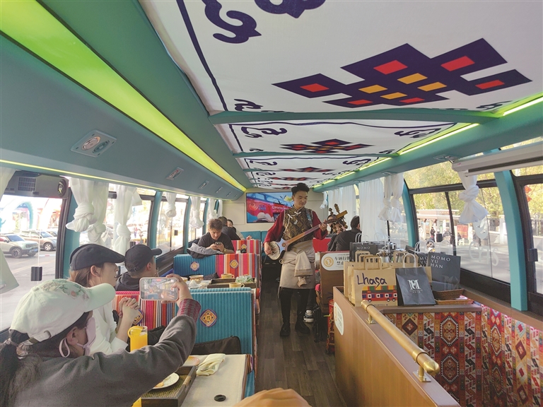 游客筱康從成都專程來到拉薩,通過網(wǎng)絡(luò)平臺(tái)了解到這輛觀光巴士后,毫不猶豫地購買車票前來體驗(yàn)。坐上巴士,窗外的風(fēng)景如同一幅流動(dòng)的畫卷,隨著車輪的前行緩緩展開。八廓商城的熱鬧繁華、布達(dá)拉宮的雄偉壯觀、拉薩河的寧靜秀麗、遠(yuǎn)處落日的余暉灑在大地上,川流不息的人群穿梭其中,側(cè)耳傾聽是城市的低語,煙火氣縈繞良久。而低頭品嘗著現(xiàn)做的美食,熱氣氤氳間,他深深感受到了這座城市的溫柔與魅力。筱康興奮地說:“我覺得這次體驗(yàn)感簡(jiǎn)直太棒了!觀光巴士沿著拉薩主城區(qū)的路線行駛,沿途可以看到大昭寺、布達(dá)拉宮、羅布林卡、拉薩河、南山公園等眾多美麗的風(fēng)景。更重要的是,車上還可以品嘗到現(xiàn)做的美食,喝著甜茶,欣賞著特色節(jié)目,還能親眼看到工作人員制作酥油茶、甜茶的過程,品嘗青稞爆米花,這種全新的體驗(yàn)真的非常值得推薦!”
