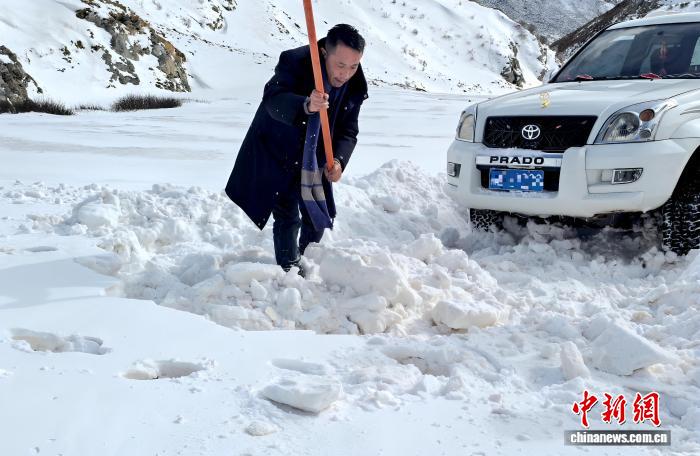 圖為在下鄉(xiāng)途中,扎西平措鏟雪開(kāi)路。巴青縣雅安鎮(zhèn)格夏貢村駐村 供圖