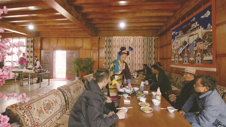 作為自治區(qū)級非遺傳承人、芒康縣“婦女致富帶頭人”的卓瑪拉姆,于2010年開辦鹽井果拉叢農家樂,憑借著正宗的加加面風味和熱情的服務,逐漸積累了口碑。2012年,在各級政府的支持下,她采用“民族特色餐飲+鄉(xiāng)村旅游接待”的經(jīng)營模式,生意日益紅火。2017年,通過貸款300萬元、自籌160萬元翻建了農家樂,將其升級為綜合型的民族特色餐飲店,經(jīng)營規(guī)模大幅擴大,最多時日接待游客達300余人。