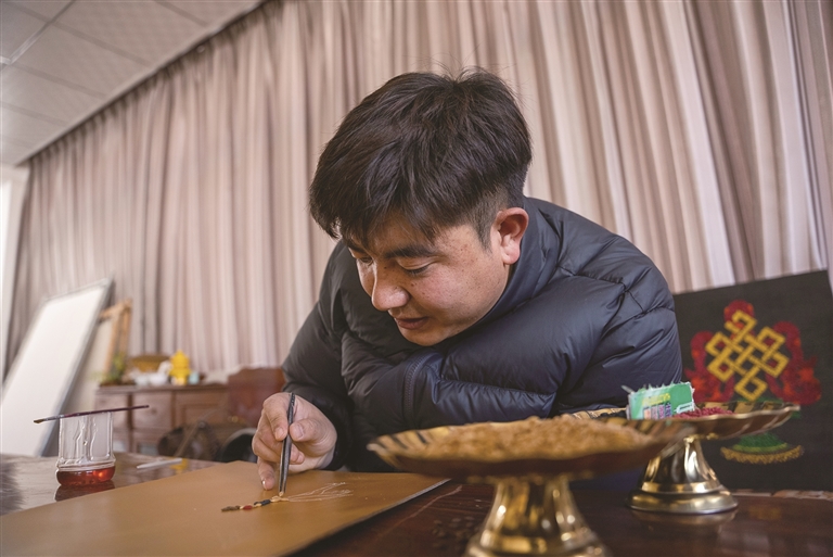 如今,仁青多吉依然在唐卡繪制與青稞文創(chuàng)之間忙碌著。陽光掠過他剛完成的一幅作品,黑頸鶴的棕褐色喙部、漸變棕灰的羽翼在光影下栩栩如生,一粒粒青稞如同被賦予了生命,靜靜訴說著林周的生態(tài)與農(nóng)耕故事。工作室里,畫師們偶爾會停下手中的筆,圍過來看他的創(chuàng)作進(jìn)度,時(shí)不時(shí)交流幾句,歡聲笑語間,傳統(tǒng)技藝的火種在默契中傳遞。