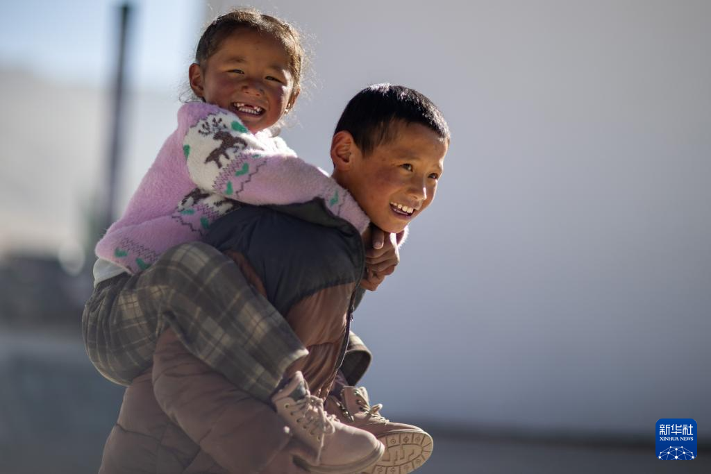 1月5日,在定日縣長所鄉(xiāng)森嘎村村史館前的廣場上,小朋友背著妹妹玩耍。新華社記者 姜帆 攝