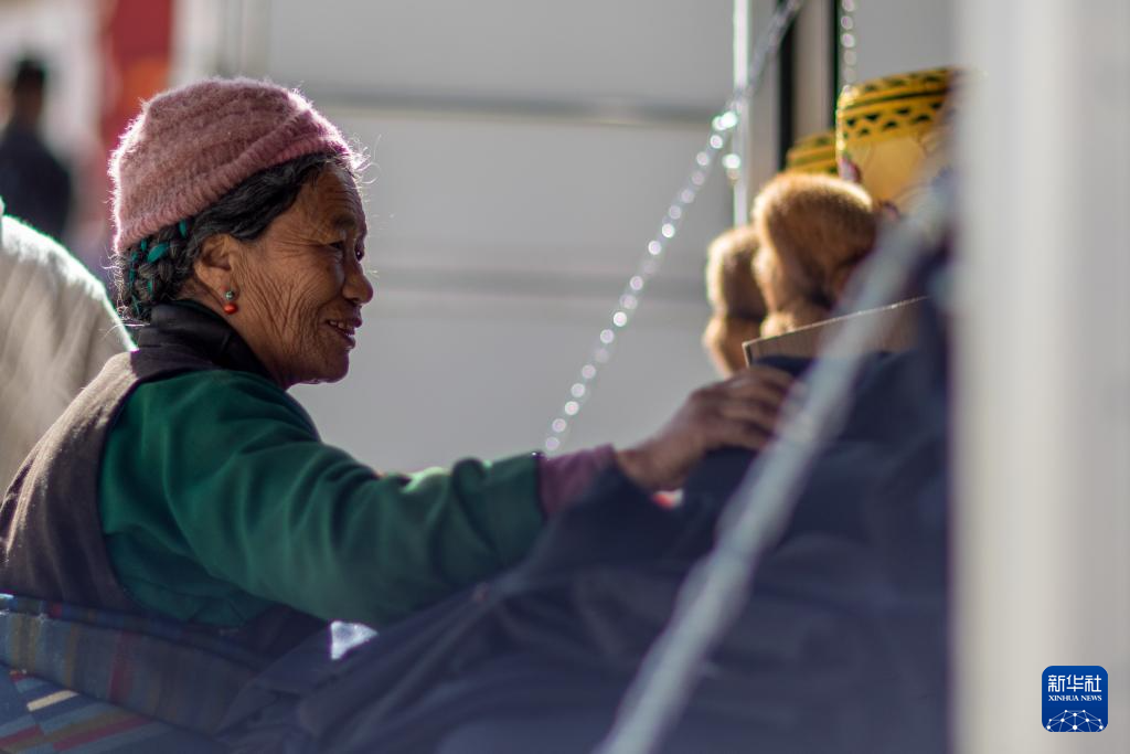 1月5日,在森嘎村村史館前的廣場上,老人曬著太陽吃著零食。新華社記者 姜帆 攝