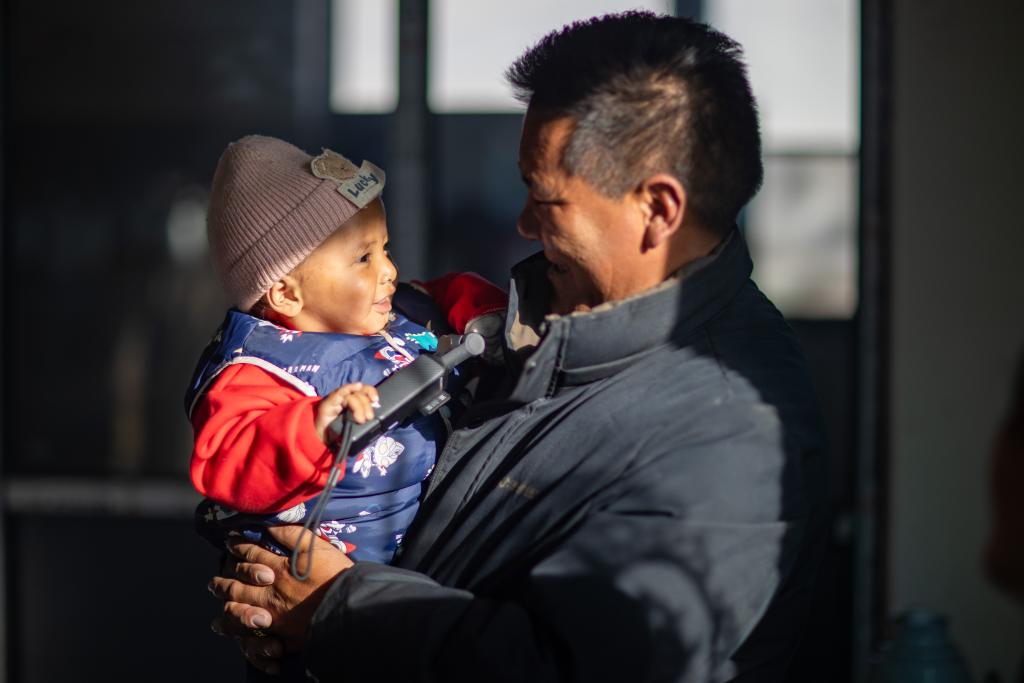 2026年1月5日,在西藏定日縣長所鄉(xiāng)雜村,長所鄉(xiāng)鄉(xiāng)黨委書記次仁旺堆(右)在次仁拉巴家中逗弄他。地震后在臨時(shí)板房居住期間,他曾當(dāng)過寶寶的臨時(shí)保姆。新華社記者 姜帆 攝