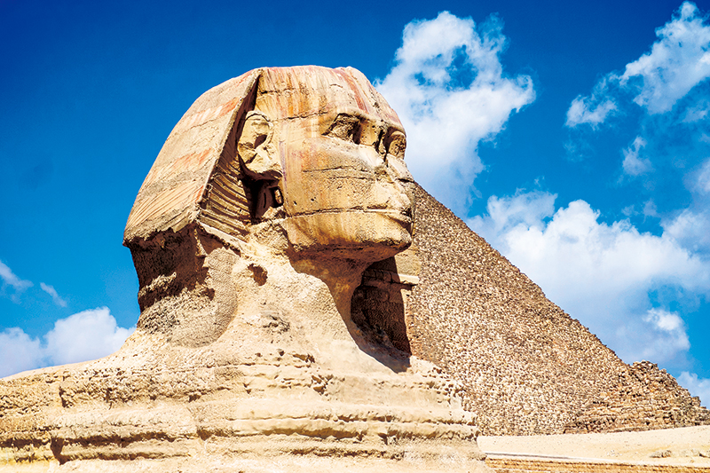 斯芬克司(獅身人面像)位于埃及哈夫拉金字塔附近,長(zhǎng)約57米,高約20米,據(jù)說(shuō)由一塊巨石雕成,象征法老威嚴(yán),是古埃及文明最有代表性的遺跡之一。圖為古埃及斯芬克司。