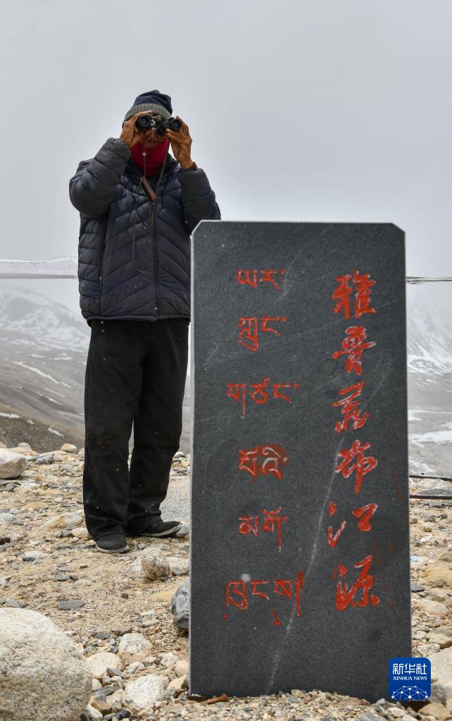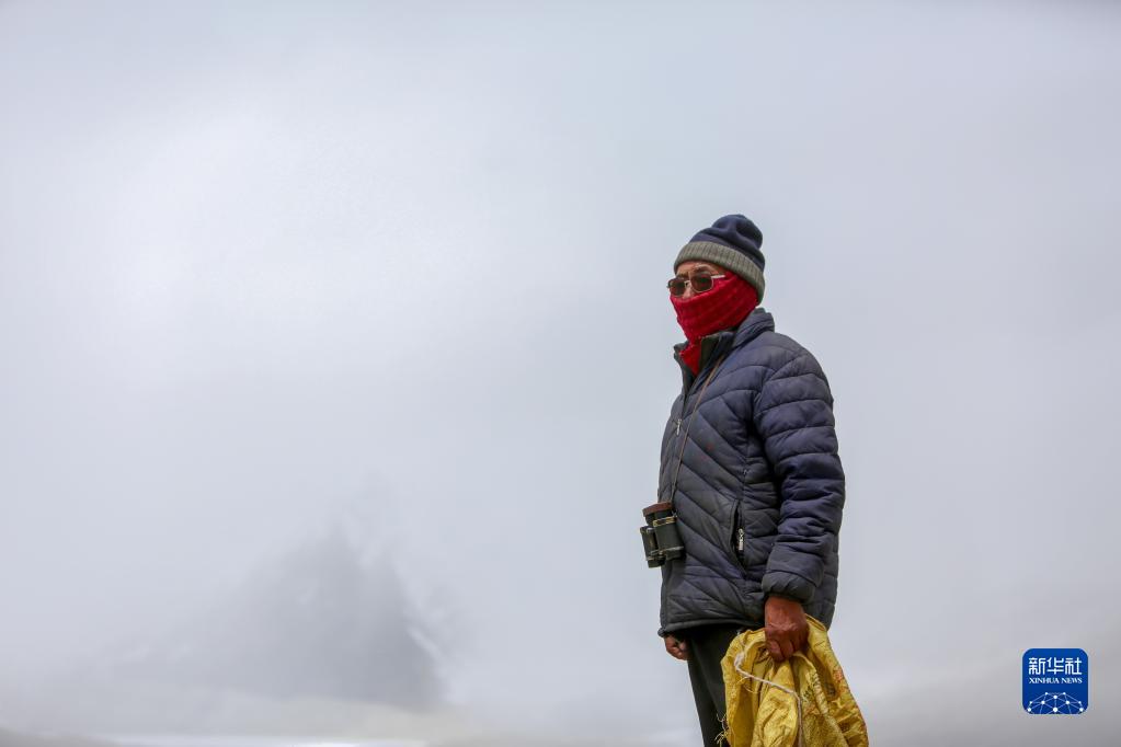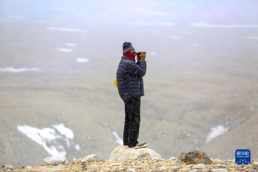 乃乃在用望遠(yuǎn)鏡查看冰川是否有異樣(5月31日攝)。新華社記者 晉美多吉 攝