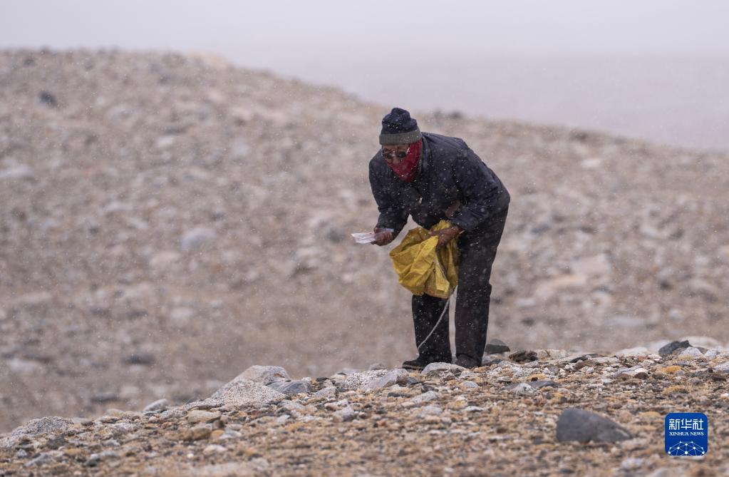 5月31日,乃乃老人在杰瑪央宗冰川山口附近撿拾垃圾。新華社記者 邵澤東 攝