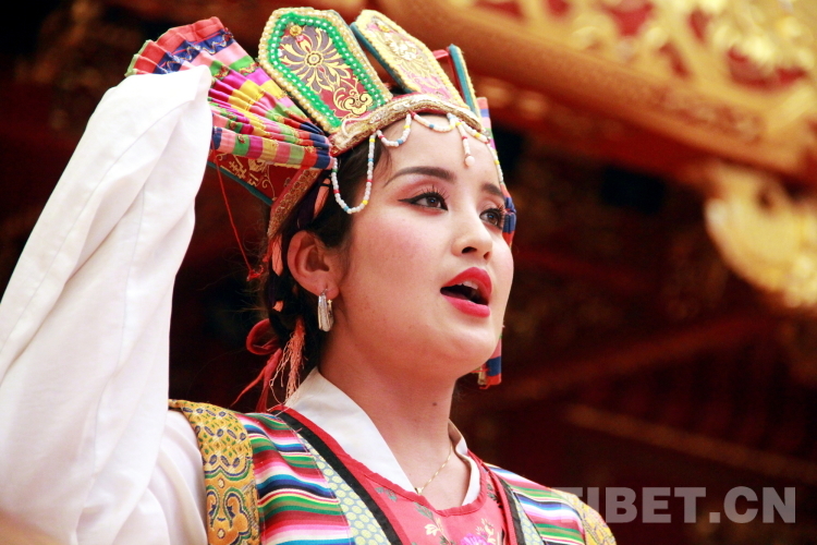 圖為拉薩市城關(guān)區(qū)娘熱民間藝術(shù)團(tuán)演員洛桑卓瑪表演藏戲開場《溫巴頓》片段 攝影:劉莉