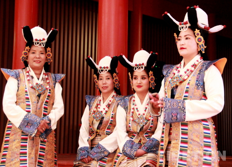 圖為拉薩市城關(guān)區(qū)娘熱民間藝術(shù)團(tuán)演員央宗(左一)、德吉卓嘎(左二,拉薩市級覺木隆藏戲傳承人)、洛桑卓瑪(左三)和強(qiáng)珍正在候場 攝影:劉莉