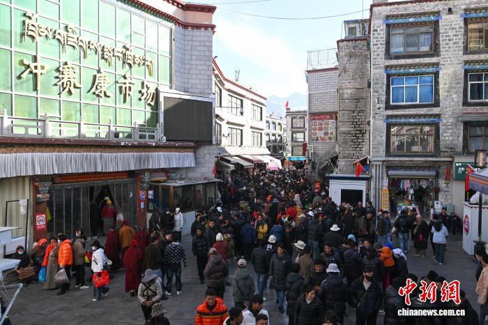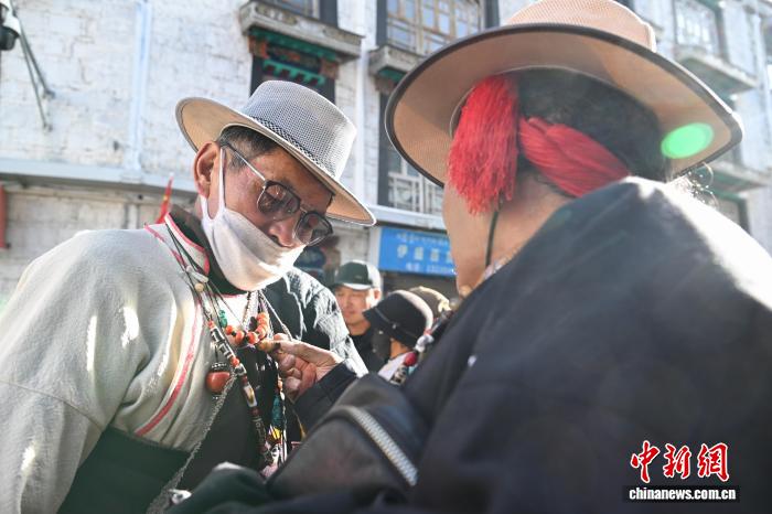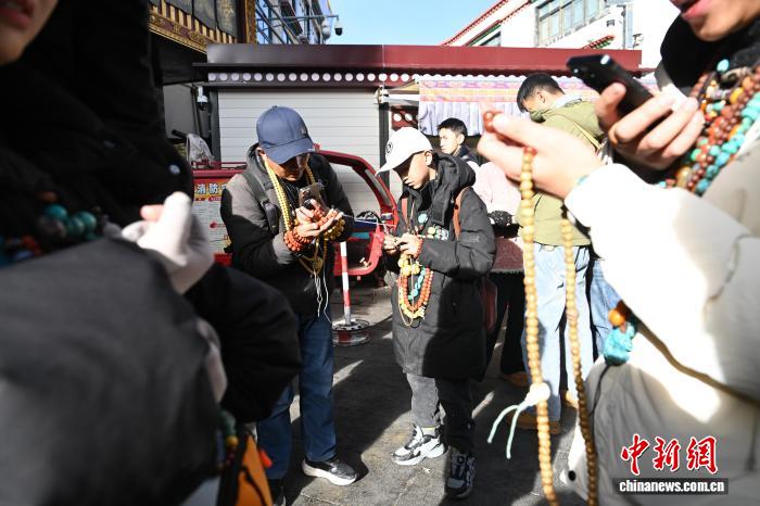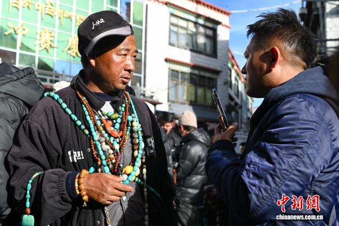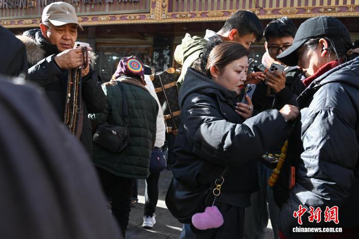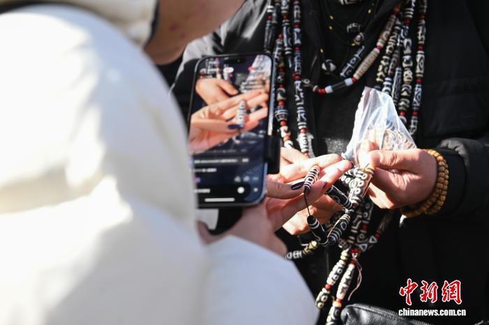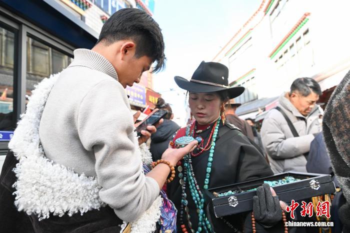 1月9日,西藏拉薩市沖賽康露天集市,在陽光下熱鬧非凡。被民眾譽(yù)為“雪域高原義烏”的沖賽康露天集市,地處八廓古城核心區(qū)域,是拉薩最具歷史的古玩與小商品交易地。藏式古玩、特色手工藝品琳瑯滿目,這里延續(xù)著“袖筒交易”等傳統(tǒng)。近年來,商人搶抓電商機(jī)遇開啟直播帶貨,線上線下聯(lián)動,讓百年市集在傳統(tǒng)韻味與現(xiàn)代商貿(mào)的碰撞中煥發(fā)新生,盡顯雪域商貿(mào)獨特魅力。圖為商人在沖賽康露天集市直播帶貨。中新社記者 貢嘎來松 攝