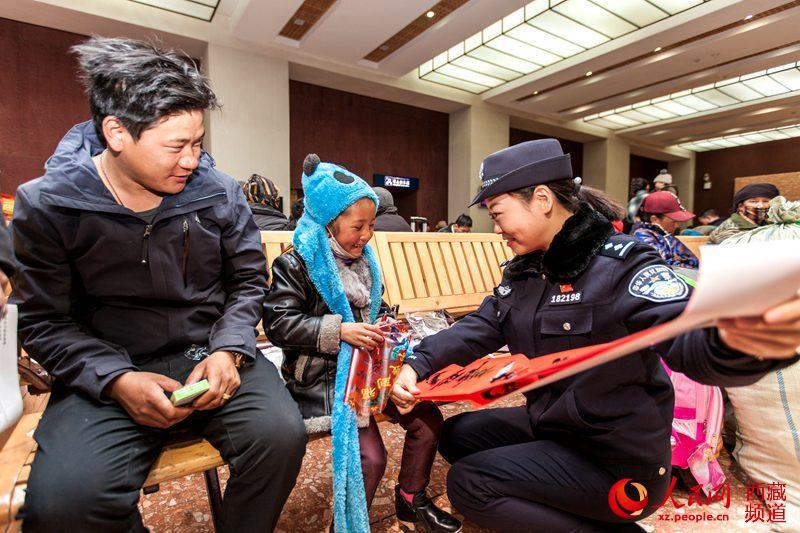 按照“平安出行、有序出行、溫馨出行”工作目標,拉薩鐵路公安處組織全處各單位干部民警共計60余人分別在西藏各火車站,緊緊圍繞“服務旅客為宗旨,待旅客如親人”的理念,開展了春運首日暨“一路溫馨一路情 天路鐵警伴您行”主題系列活動。圖為拉薩鐵路公安處民警(右一)向“小旅客”發(fā)放春聯(lián)。圖片來源:人民網