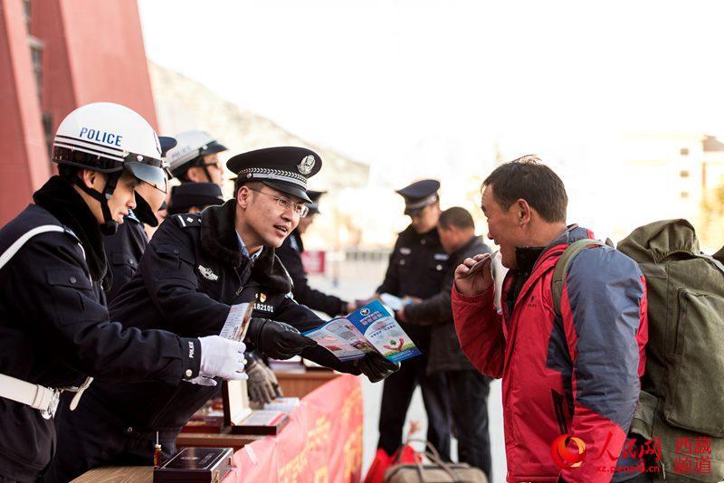 春運首日,拉薩鐵路公安處干警為旅客群眾做好事達800余件,為旅客解答問題3000余次,發(fā)放春運各類宣傳資料3000余份,全力打造“平安、有序、溫馨”的春運環(huán)境。圖為拉薩鐵路公安處民警為旅客講解禁毒常識。圖片來源:人民網