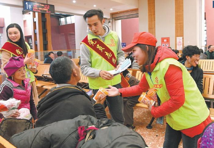 拉薩火車站團委聯(lián)合中國移動西藏公司開展“黨團志愿者愛心送溫暖 服務春運返鄉(xiāng)農民工”主題活動,一個個黨團員志愿者的身影在候車室里忙碌著。圖為2月1日,中國移動西藏公司的志愿者正在拉薩火車站候車室給旅客發(fā)放奶茶、礦泉水。 圖片來源:西藏日報 李洲 攝