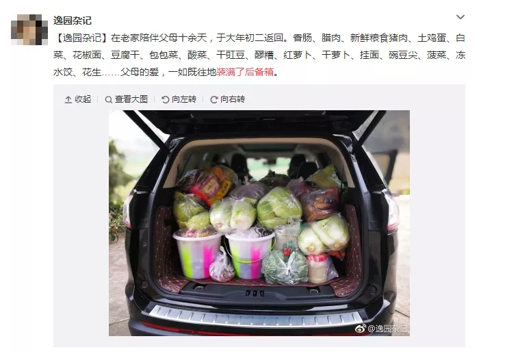 昨日,游子們從家這個港灣里,鳴笛啟航,奔向遠(yuǎn)方。除了對鄉(xiāng)愁的百轉(zhuǎn)千回,更有親情的濃郁化不開。這幾天,網(wǎng)友們都在微博里曬圖,“媽媽給裝的后備箱”的話題,一時成了熱點(diǎn)——“親手做的馬蹄糕”“最愛的家鄉(xiāng)小柚柑”“一大罐子土榨花生油”“秋天腌的糖蒜”……后備箱被爸媽塞得滿滿的,不愿帶還不高興。于是乎,調(diào)皮的網(wǎng)友留言:“明年我開個貨車回來過年!”