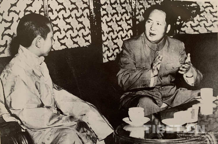 1951年4月,十世班禪親自率領(lǐng)班禪堪布會議廳主要官員到北京,受到毛澤東主席親切接見(選自大師珍藏的畫冊)。(翻拍自《十世班禪大師 劉隆攝影集》)