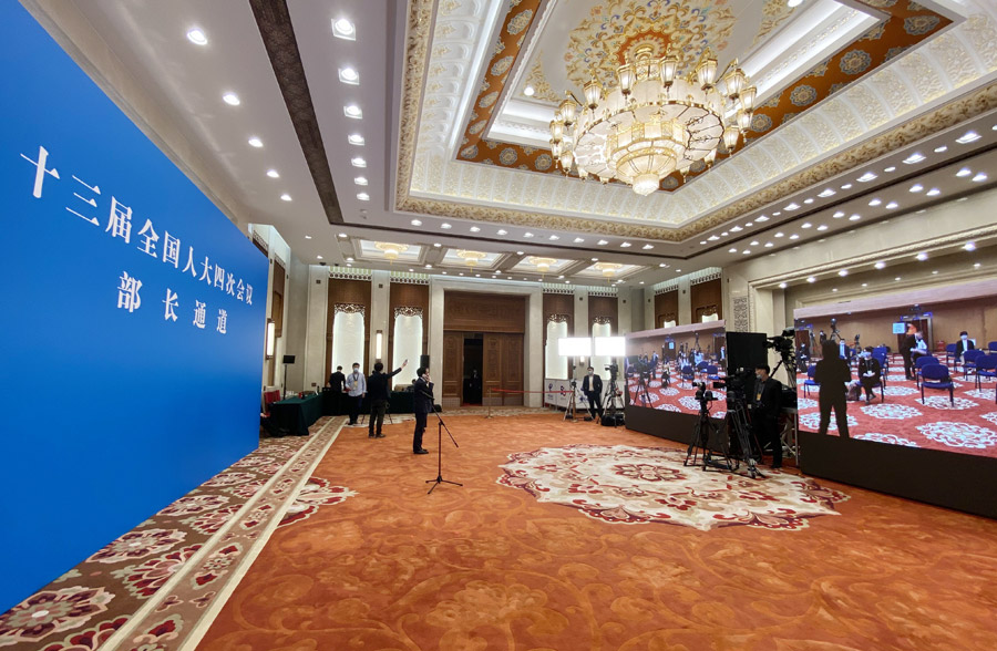 3月5日,十三屆全國人大四次會議開幕會結(jié)束后,舉行首場“部長通道”采訪活動,邀請部分列席會議的國務(wù)院有關(guān)部委負責人通過網(wǎng)絡(luò)視頻方式接受采訪。圖為“部長通道”現(xiàn)場。新華網(wǎng) 王翰林 攝