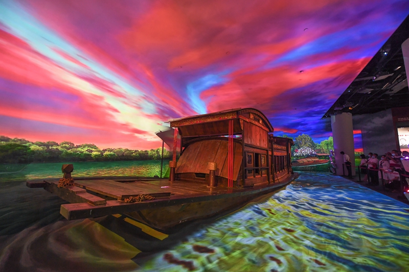 民族復(fù)興歷史任務(wù)是偉大建黨精神形成的時代背景。慶祝建黨百年之際,浙江嘉興的南湖革命紀(jì)念館迎來參觀熱潮,“紅船起航”主題展覽日均參觀人數(shù)超過10000人次。南湖革命紀(jì)念館基本陳列“紅船起航”主題展覽由“救亡圖存”、“開天辟地”、“光輝歷程”、“走向復(fù)興”4個部分組成,全面展現(xiàn)100年來,中國共產(chǎn)黨團(tuán)結(jié)帶領(lǐng)中國人民取得革命、建設(shè)和改革偉大勝利的光輝歷史。圖為參觀者在南湖革命紀(jì)念館內(nèi)參觀紅船模型及多媒體場景重現(xiàn)。新華社記者 徐昱/攝