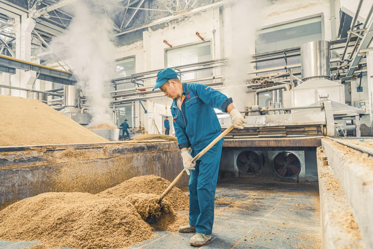 記者看到,待原糧入窖發(fā)酵之后,便開始了出窖蒸餾工序。工作人員把出窖酒醅用清蒸除雜的谷糠拌勻,以疏松酒醅,利于蒸餾使蒸汽均勻穿透。谷糠的使用量在頭楂、二楂、三楂、四楂按照酒醅重量依次遞減,裝甄遵循“輕、松、薄、勻、緩”的操作法。待出酒時嚴(yán)格控制溫度,既可少損失酒、少跑酒香,同時最大限度地提升酒質(zhì)。