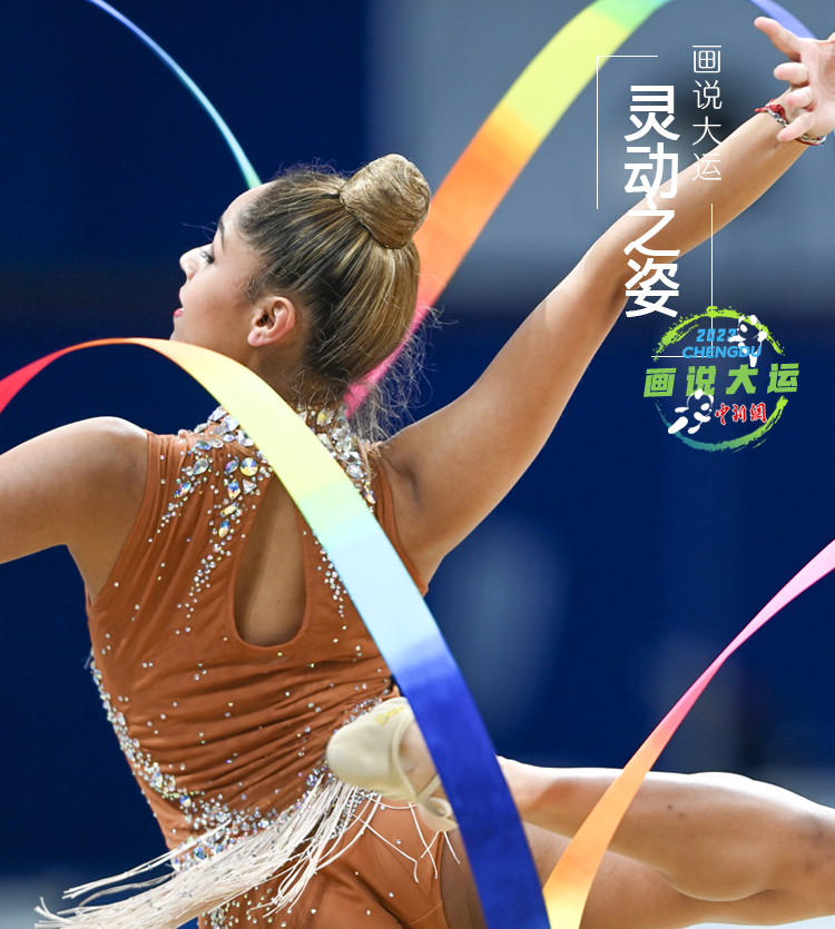 在成都第31屆世界大學生夏季運動會藝術體操的賽場上,運動員們用柔和挺拔的身姿,向我們詮釋了青春的靈動之美。輕盈流暢的體操動作搭配剛柔并濟的舞姿,這是力與美的結合,更是柔與韌的藝術!圖為南非選手DEWAN Azra參加藝術體操個人全能決賽。