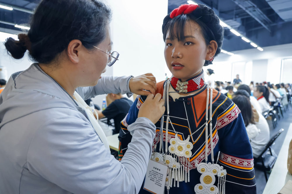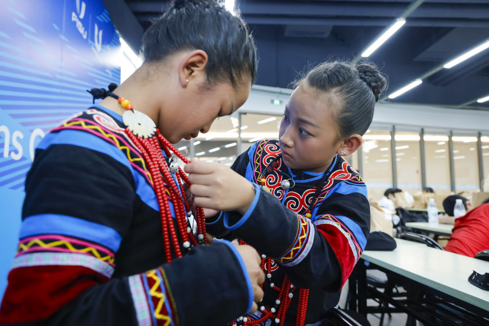 7月23日,在成都大運(yùn)會(huì)開(kāi)幕式彩排之前,吉合拉作(右)幫助俄地惹漢整理飾品。新華社記者沈伯韓 攝