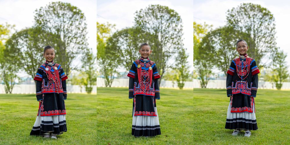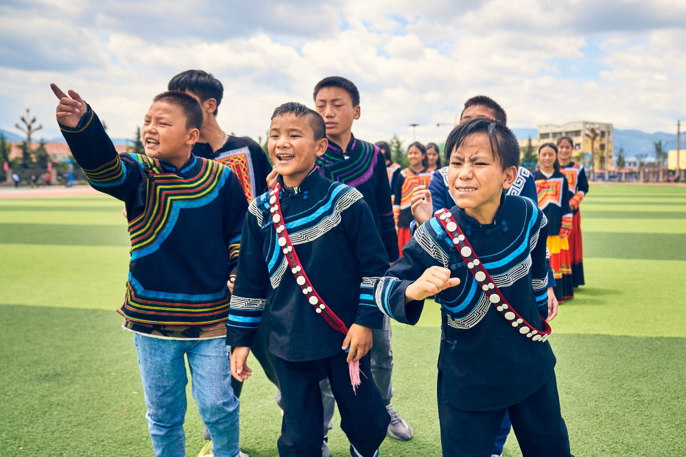 7月2日,在昭覺(jué)縣萬(wàn)達(dá)融創(chuàng)紅絲帶愛(ài)心學(xué)校參與排練的俄地惹漢(前左)、馬杰英(前中)和吉合拉作(前右)。(受訪(fǎng)者供圖)