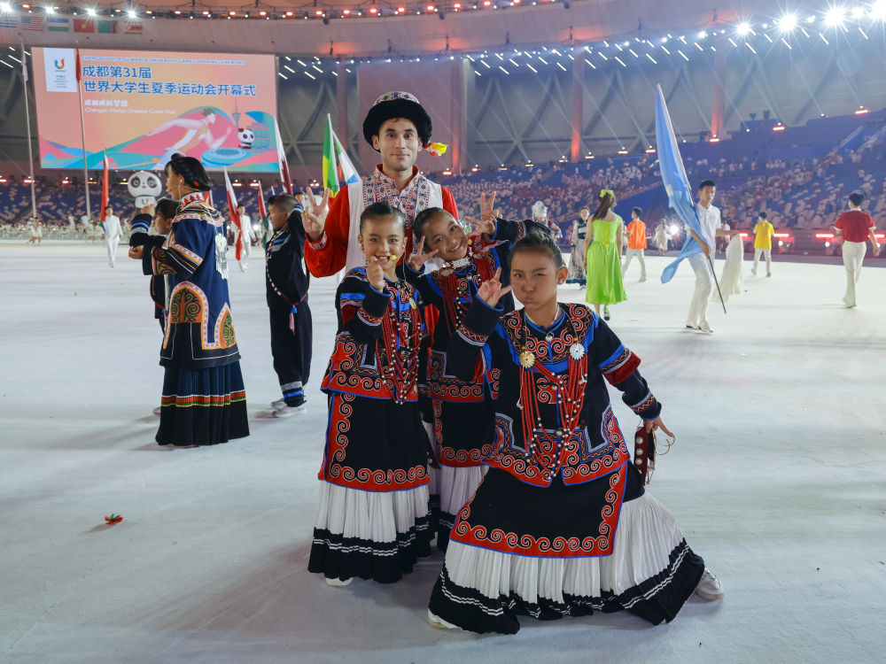 7月23日,在成都大運(yùn)會(huì)開(kāi)幕式彩排結(jié)束后,俄地惹漢、馬杰英和吉和拉作(前左至右)與來(lái)自新疆的塔吉克族演員拍攝合影。新華社記者沈伯韓 攝