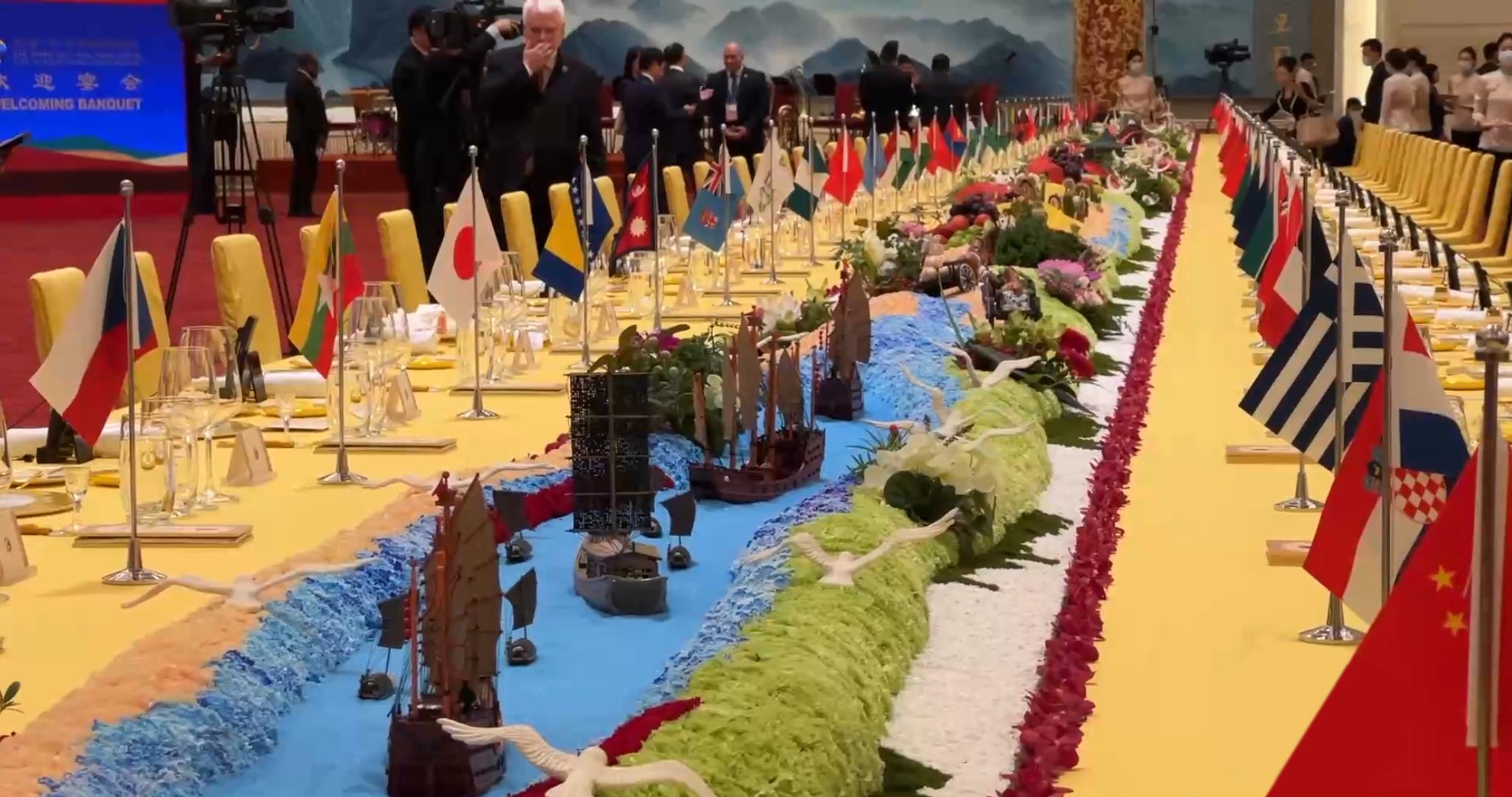 在10月17日晚舉行的歡迎宴會上,嘉賓們被這樣一個細節(jié)深深打動——晚宴餐臺以“撫古觀今、擁抱未來”為主題,南側(cè)展示著古代絲綢之路的微觀景象:海邊碼頭上擺放著對外出口的瓷器、絲綢、茶葉等貿(mào)易物資,路上擺放有從西域引進的蔬菜瓜果;餐臺北側(cè)為21世紀絲綢之路的景觀:以北京天壇的裝飾為起點,中間穿插高鐵、中歐班列、新能源汽車等擺件,展現(xiàn)各國互聯(lián)互通的景象……
