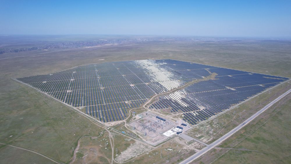 這是5月4日拍攝的哈薩克斯坦阿拉木圖州卡普恰蓋100兆瓦光伏電站(無人機照片)。這里的太陽能光伏板通過中歐班列運輸至此。